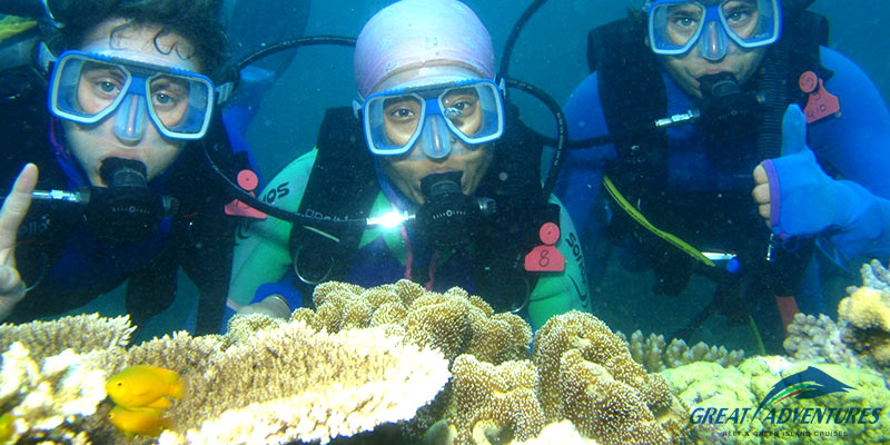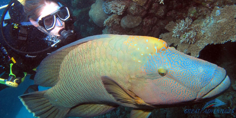 Departing from Cairns, Great Adventures takes you to a spacious multi-level reef activity platform (pontoon) situated on the outer edge of the Great Barrier Reef. With a wide range of activities, the pontoon provides a great option for experienced divers traveling with non-diving companions. Certified divers can dive directly off the platform to explore selected sites like Turtle Sanctuary, First Bommie and Secret Gardens with depths to about 16 metres. Expect to see a wide variety of colourful corals, green and hawksbill turtles, giant clams, diverse fish species including maori wrasse, barracuda fusiliers, anemone fish, bat fish, coral trout, sweetlips and trevally.
